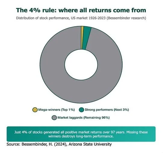 As you can see, over the 97-year period, market returns have been generated by only 4% of stocks which means that not holding those stocks will be detrimental to long-term performance. It probably also explains why equity fund managers who don’t have any exposure to the ‘magnificent 7’ stocks are finding it particularly difficult in terms of performance.